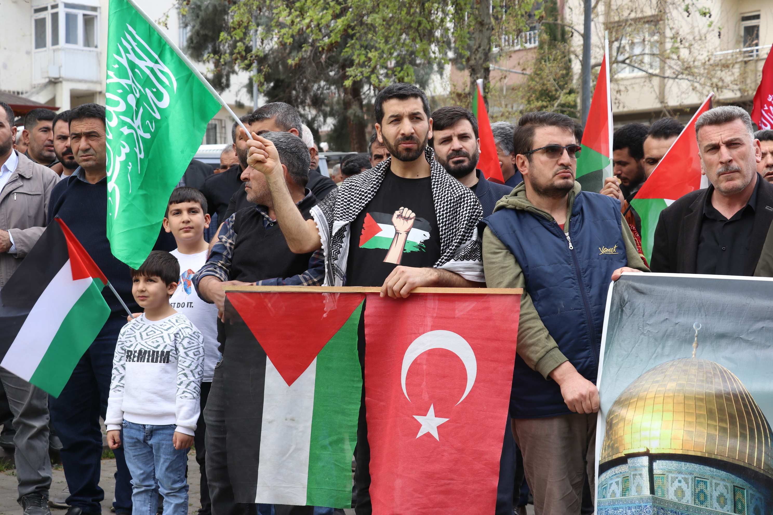 Cuma namazının ardından cami avlusunda toplanan yüzlerce kişi, kadın, erkek, genç ve yaşlı demeden Kudüs ve Mescid-i Aksa’ya olan bağlılıklarını bir kez daha gösterdi. Ellerinde Filistin bayrakları ve dövizler taşıyan katılımcılar, Gazze ve Filistin’de zulüm gören Müslümanları unutmadıklarını haykırarak İslam ümmetinin Kudüs davasına sahip çıkması gerektiğini vurguladı.