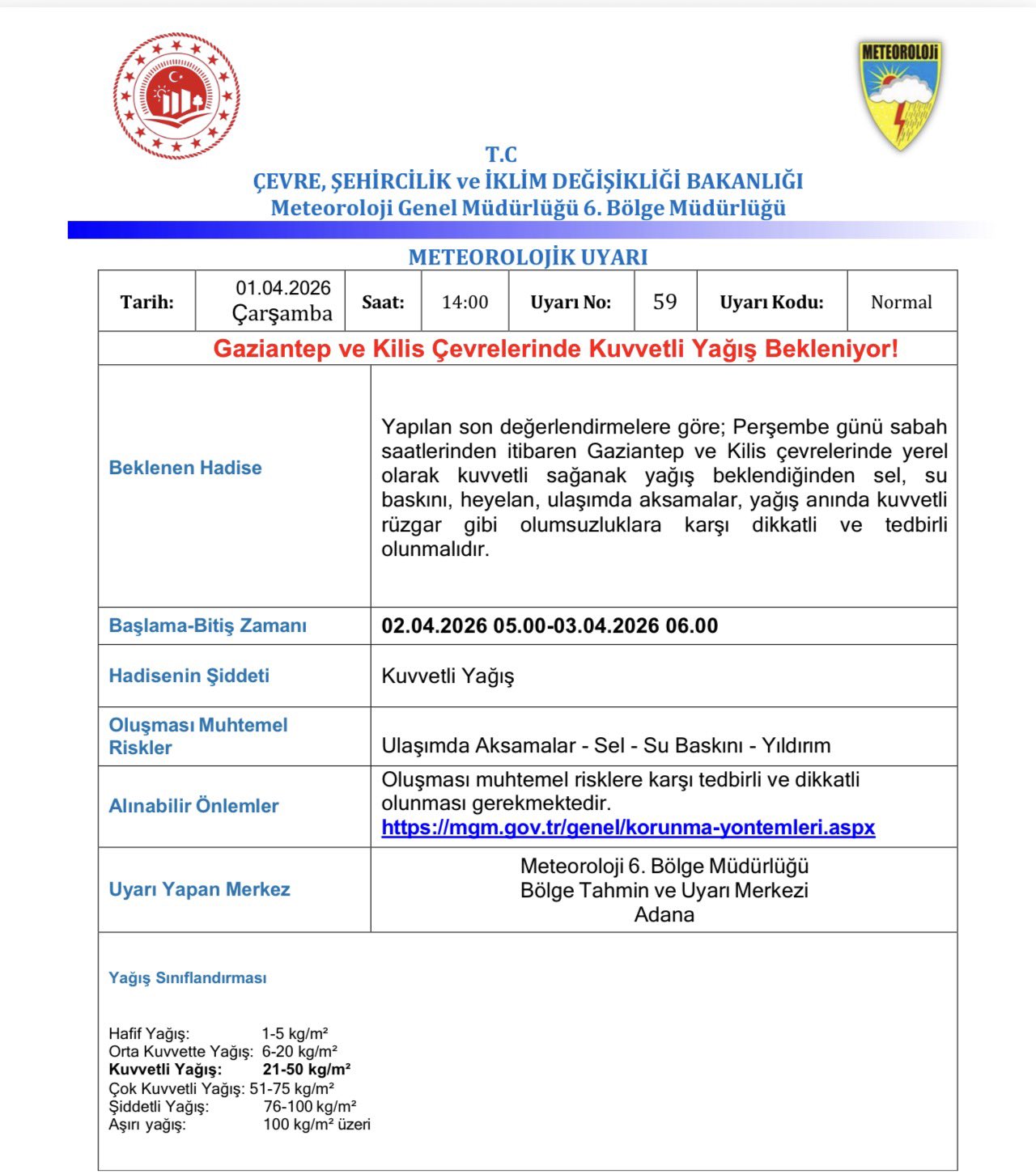 Uyarının 2 Nisan saat 05.00 ile 3 Nisan saat 06.00 arasında geçerli olacağı belirtildi.