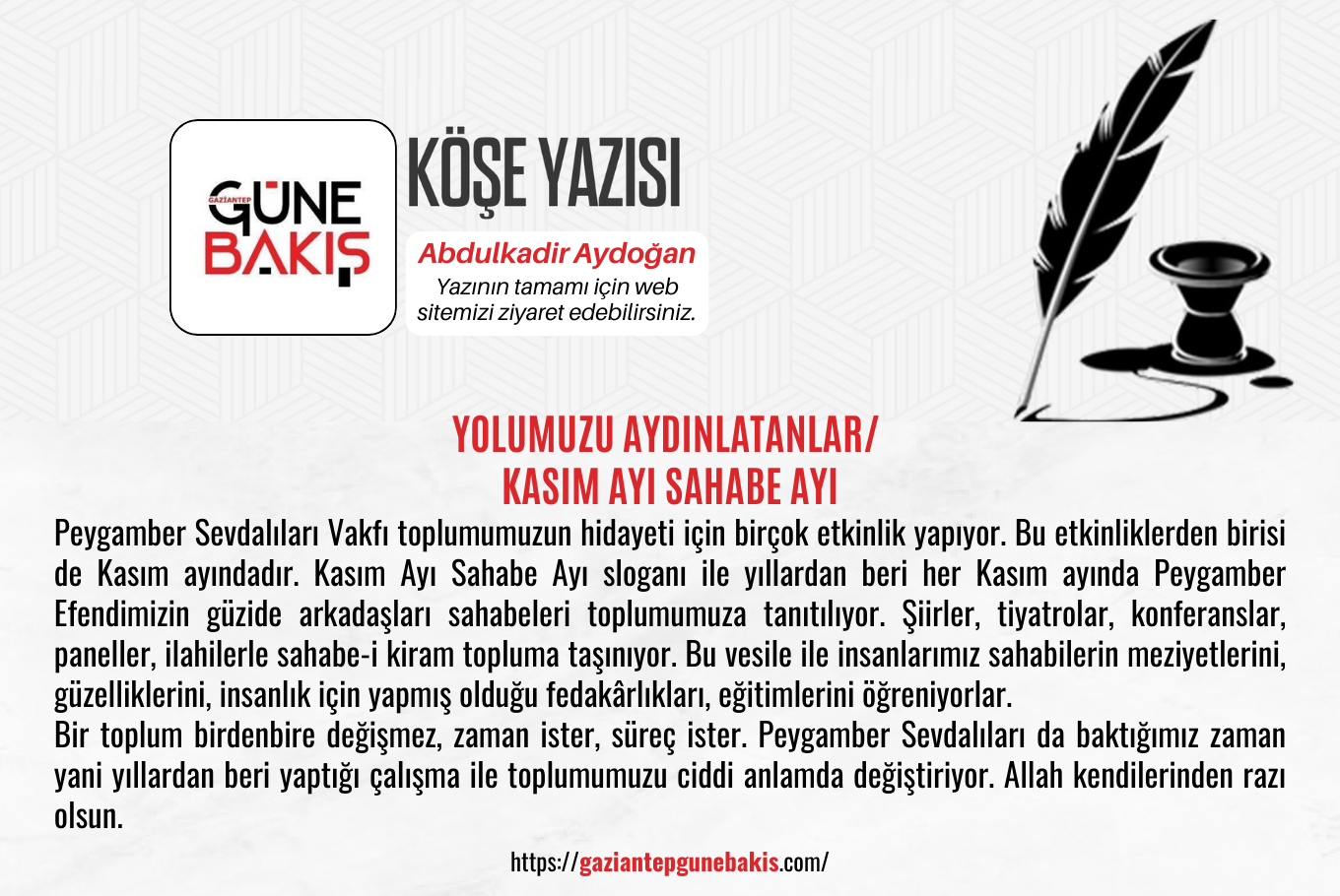 Bu etkinliklerden birisi de Kasım ayındadır. Kasım Ayı Sahabe Ayı sloganı ile yıllardan beri her Kasım ayında Peygamber Efendimizin güzide arkadaşları sahabeleri toplumumuza tanıtılıyor. Şiirler, tiyatrolar, konferanslar, paneller, ilahilerle sahabe-i kiram topluma taşınıyor.