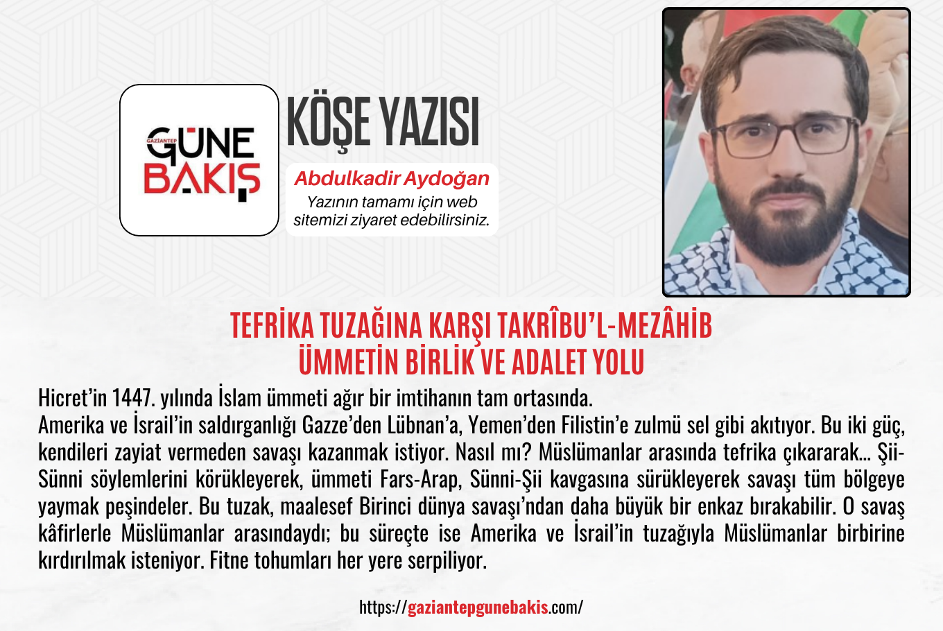 Sonuç olarak, 1447 Hicri’de ümmetin en büyük ihtiyacı takrîbu’l-mezâhibdir. Farkları zenginlik, ortakları esas kabul ederek, emperyal tuzağa karşı tek yumruk olmalıyız. İmam Humeyni’nin, Erbakan’ın, Nursi’nin ve Laricani gibi şehidlerin mirası bunu emrediyor. Birlikte direnirsek zafer yakındır. Allah ümmetimizi tefrikadan muhafaza buyursun.
