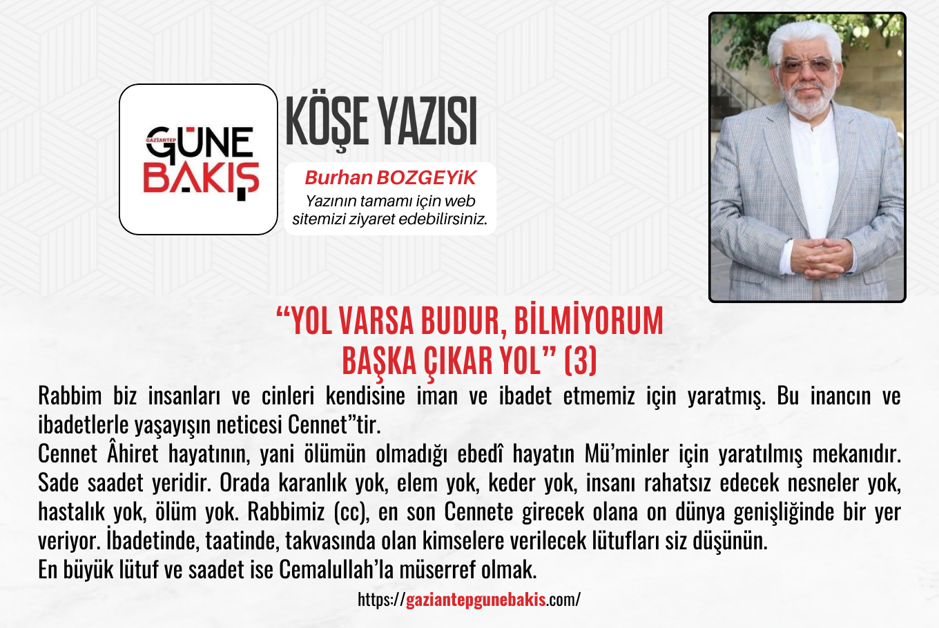 İşte Mü’min olan, Müslüman olan kimseler bu dünya ve âhiret dengesini gözetmeli, bu dünyada ne kadar kalacaksa o kadar bu dünya’ya değer vermeli (Helal dairesinden ayrılmamalı), hayatının her safhasında ebedî hayat yurdu için çalışmalı ona göre hareket etmelidir. Yani helal dairesinde kalmalı, haramlardan şiddetle kaçınmalı, Peygamber Efendimizin (asm) yolundan yürümeli, farzları yapmalı, her daim Allah’ın hükümlerini hâkim kılmayı, cihadı ve İ’la-yı Kelimetullahı düşünmelidir. Bu düşüncenin neticezi izzet ve şeref kazanmak, zaferler elde etmek, nice fütuhatlara mazhar olmaktır. Tarihte bu düşüncede olan İslam devletlerinin, kahramanlarımızın, şehitlerimizin ve gazilerimizin mazhar olduğu gibi.. (Burhan BOZGEYİK)