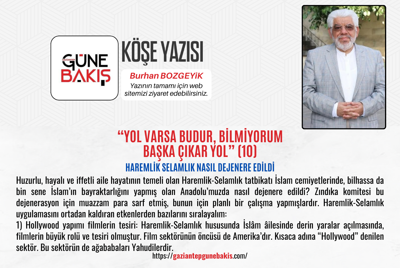 2) Yeşilçam filmlerinin tesiri: Bütünüyle Hollywood’un bir taklidi olan “Yeşilçam” üretimi filmlerin neredeyse tamamında İslâmî hassasiyete, bilhassa “Haremlik-Selamlık” konusuna dikkat edilmemiştir. Yaklaşık yüz yılda üretilmiş binlerce filmin hemen hemen tamamında İslan’ın temel emirlerinden biri olan “Haremlik-Selamlık” inancı sanki hiç yokmuş gibi davranılmıştır.