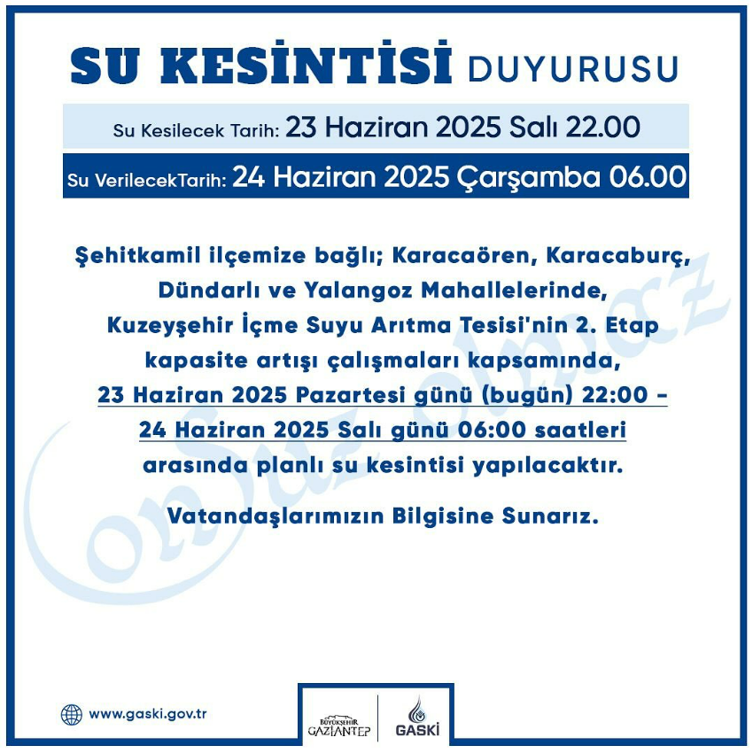 Gaziantep Su ve Kanalizasyon İdaresi’nden (GASKİ) yapılan açıklamaya göre, Kuzeyşehir İçme Suyu Arıtma Tesisi’nin 2. Etap kapasite artışı çalışmaları nedeniyle söz konusu bölgelerde planlı su kesintisi uygulanacak.