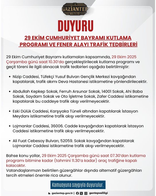 Gaziantep Valiliği tarafından yapılan açıklamaya göre, kutlama programı ve fener alayı etkinlikleri nedeniyle kentte trafik düzenlemesine gidilecek. Sabah saat 07.30’dan, kutlama programının sona ereceği tahmini 11.30’a kadar belirli güzergâhlarda araç geçişine izin verilmeyecek.