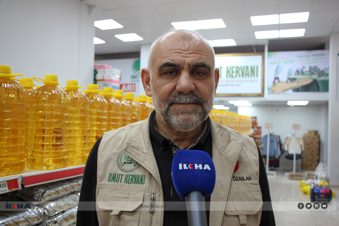 "Daha önceden Gaziantep'te ihtiyaç sahiplerine koliler götürüyorduk. Fakat şimdi yeni bir sisteme geçtik. Sistemimizde sosyal market adı altında faaliyetlerimizi yürüteceğiz. Sosyal market ne demek? Sosyal market bildiğiniz market türü bir çalışma. Daha önce gıda kolisi götürdüğümüz ailelere şimdi kart dağıtacağız. Aileler kendi kartlarını alıp sosyal marketimize gelecek. Burada kendi ihtiyaçlarını kendi elleriyle temin edecekler."