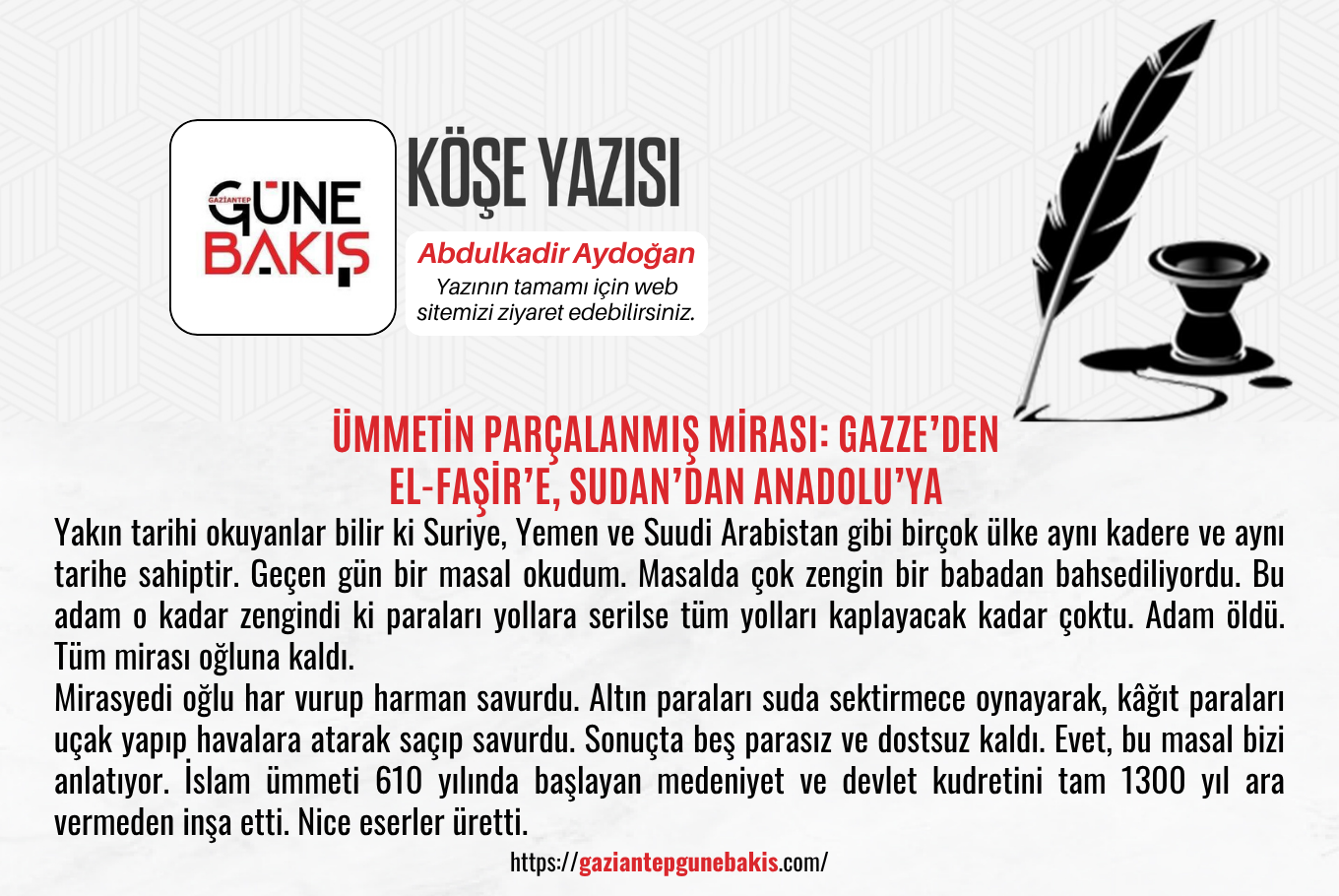 Türkiye bu çağrının öncüsü olabilir. “Dünya beşten büyük” haykırışı ümmetin uyanışının ilk kıvılcımıdır. Emperyalistlerin petrolü, altını ve hegemonyası bitecek.Afganistan' da olduğu gibi İslam coğrafyası bağımsız İslami yönetimlerle yeniden doğacak.Ey ümmet! Mirasyedi olma. Mirası koru ve birliği dirilt. Gazze’nin, El-Faşir’in ve Yemen’in kanı senin damarlarında akıyor.