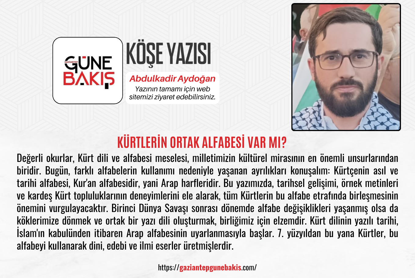Türkiye'deki Kürtler ise 20. yüzyıl başlarında Latin alfabesine geçmişlerdir; bu, Osmanlı'dan kalan Arap alfabesinin terk edilmesiyle başlayan bir süreçtir. Ancak bu alfabe değişikliği, Kürt birliğini zedelemiştir. Tarihte Kürtler, yüzyıllarca Arap alfabesiyle yazmıştır.Latin alfabesi ise son dönem gelişmelerinin ürünüdür. Tüm Kürtler – Türkiye'den, Suriye'den, Irak'tan, İran'dan – oturup istişare etmeli ve ortak alfabe olarak Kur'an alfabesini benimsemelidir. Diyanet İşleri Başkanlığı başta olmak üzere, hutbelerde ve dini çalışmalarda Kur'an alfabesi yani Arap alfabesi kullanılarak daha net adımlar atılabilir. Kürtlerin talebi olan Diyanet İşleri Başkanlığı'nın hutbelerini Kürkçe yayınlanması meselesi, hava limanları dahil ortak kullanım alanlarında Kürtçe ibarelere de yer verilmesi için Kürkçenin bir yazı diline sahip olması gerekir.