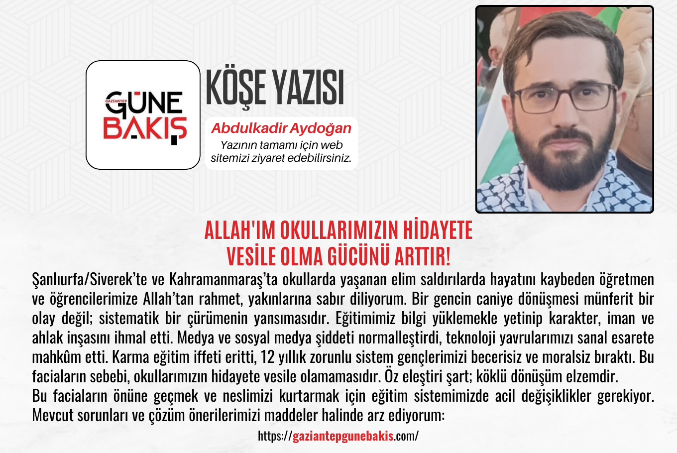 Şanlıurfa/Siverek’te ve Kahramanmaraş’ta okullarda yaşanan elim saldırılarda hayatını kaybeden öğretmen ve öğrencilerimize Allah’tan rahmet, yakınlarına sabır diliyorum. Bir gencin caniye dönüşmesi münferit bir olay değil; sistematik bir çürümenin yansımasıdır. Eğitimimiz bilgi yüklemekle yetinip karakter, iman ve ahlak inşasını ihmal etti. Medya ve sosyal medya şiddeti normalleştirdi, teknoloji yavrularımızı sanal esarete mahkûm etti. Karma eğitim iffeti eritti, 12 yıllık zorunlu sistem gençlerimizi becerisiz ve moralsiz bıraktı. Bu faciaların sebebi, okullarımızın hidayete vesile olamamasıdır. Öz eleştiri şart; köklü dönüşüm elzemdir.