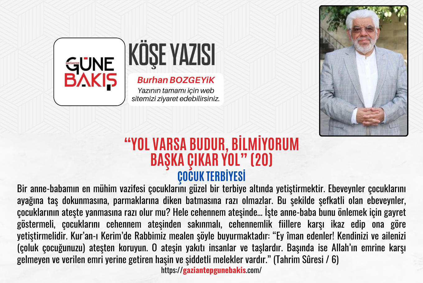 Bir anne-babamın en mühim vazifesi çocuklarını güzel bir terbiye altında yetiştirmektir. Ebeveynler çocuklarını ayağına taş dokunmasına, parmaklarına diken batmasına razı olmazlar. Bu şekilde şefkatli olan ebeveynler, çocuklarının ateşte yanmasına razı olur mu? Hele cehennem ateşinde… İşte anne-baba bunu önlemek için gayret göstermeli, çocuklarını cehennem ateşinden sakınmalı, cehennemlik fiillere karşı ikaz edip ona göre yetiştirmelidir.